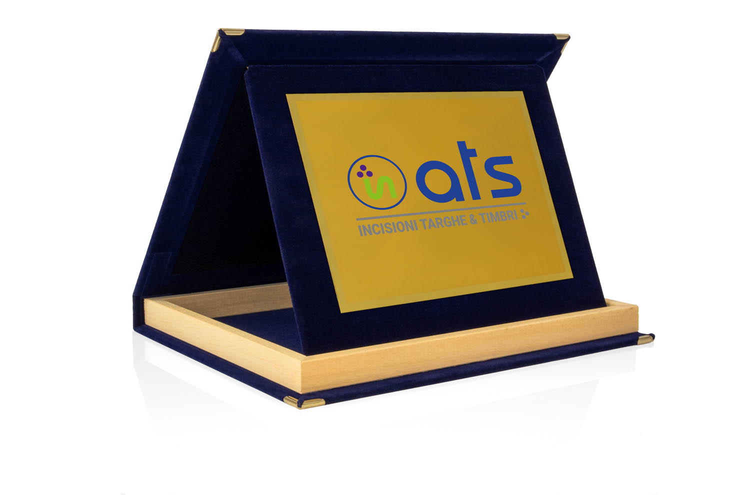 Targa Personalizzata con Astuccio in Velluto Blu con bordino in legno + Targa Oro